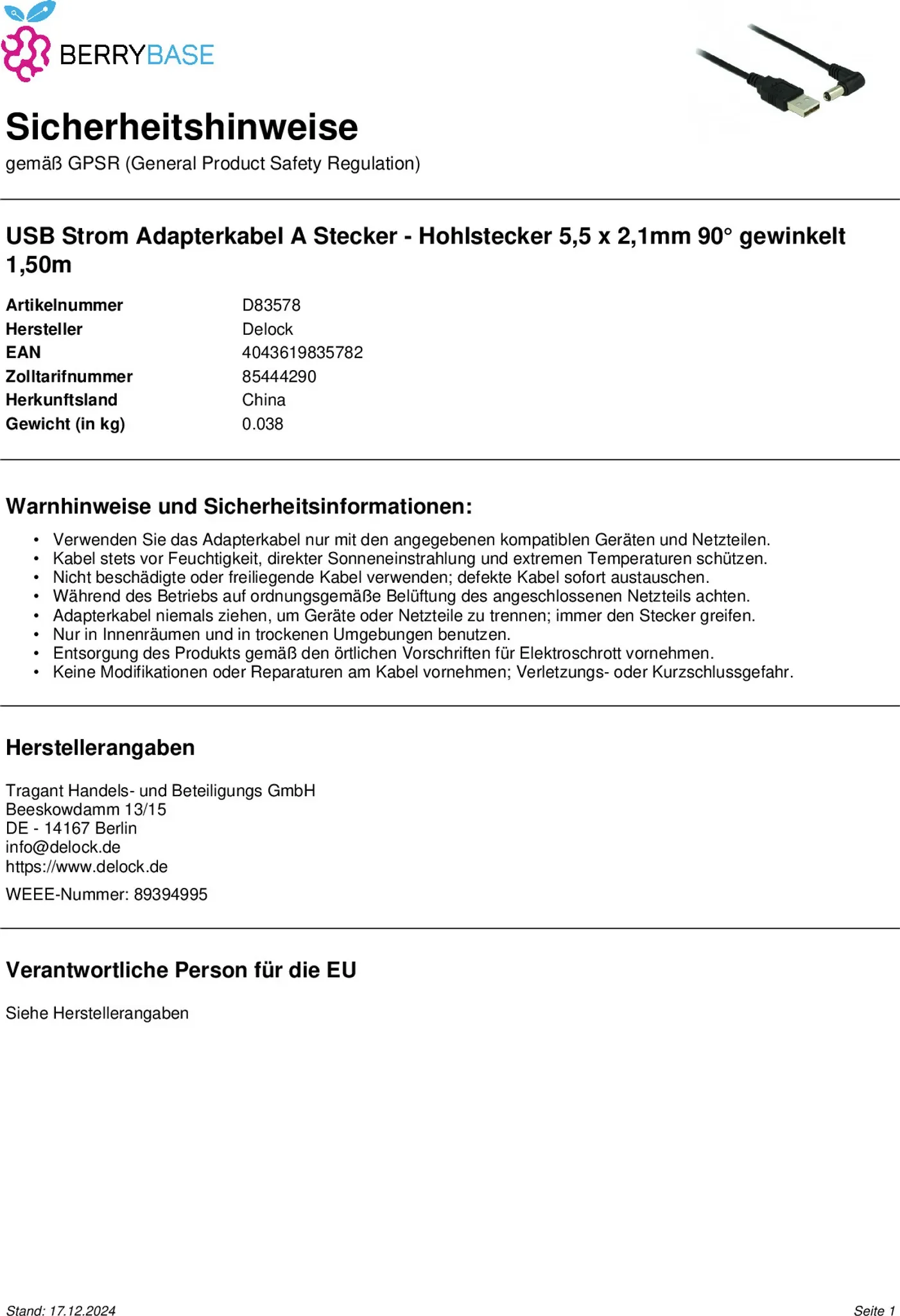 | Enthalten | 1 × DELOCK 83578 USB A → DC Netzkabel, 1,5 m |