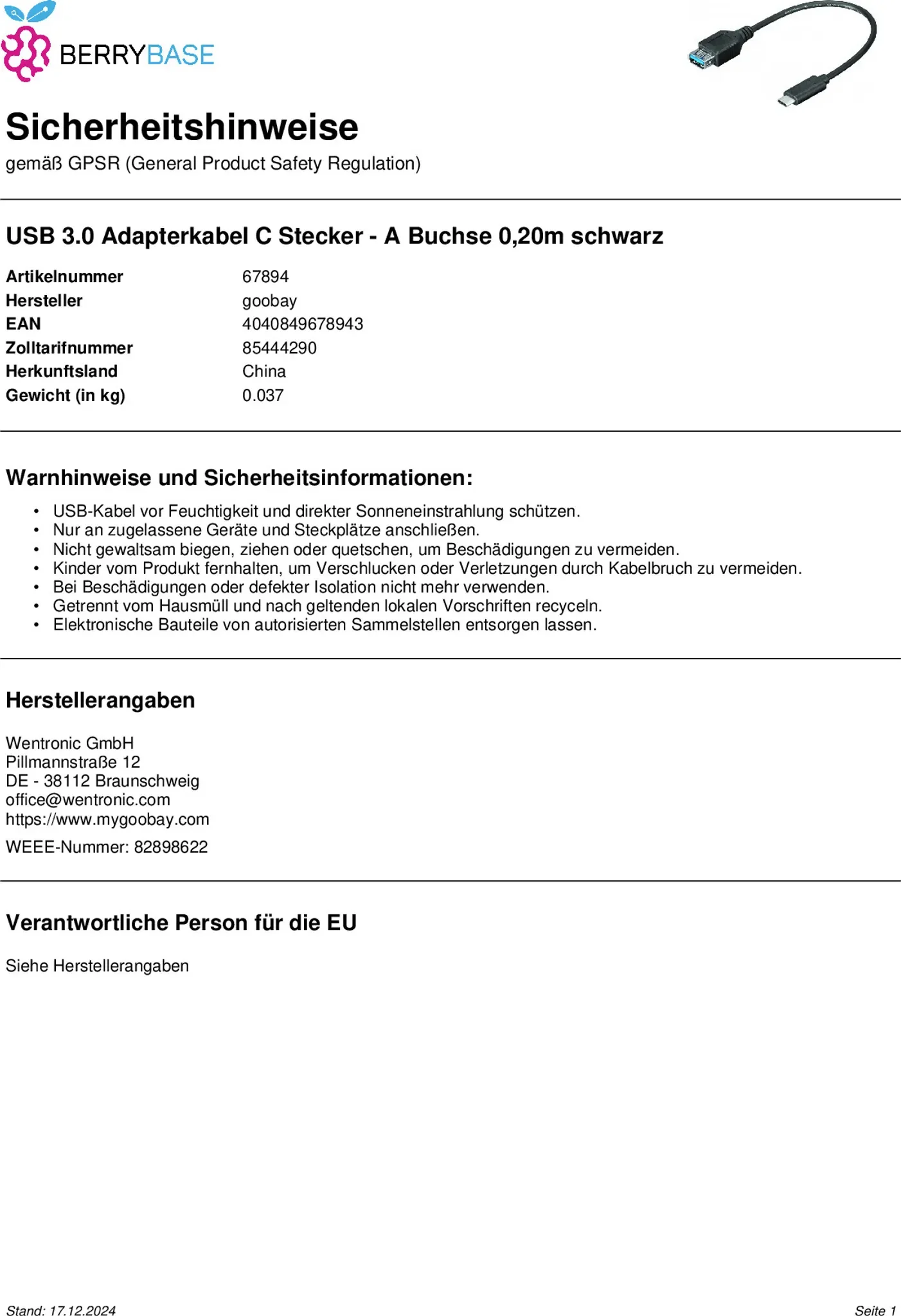 Produktinformationen "Goobay USB-C™ auf USB-A Buchse Kabel – 0,2 m, Schwarz"