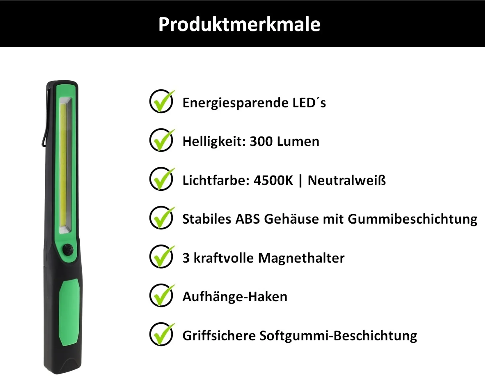 | Enthalten | 1 × LED Arbeitsleuchte (Batterien nicht enthalten) |