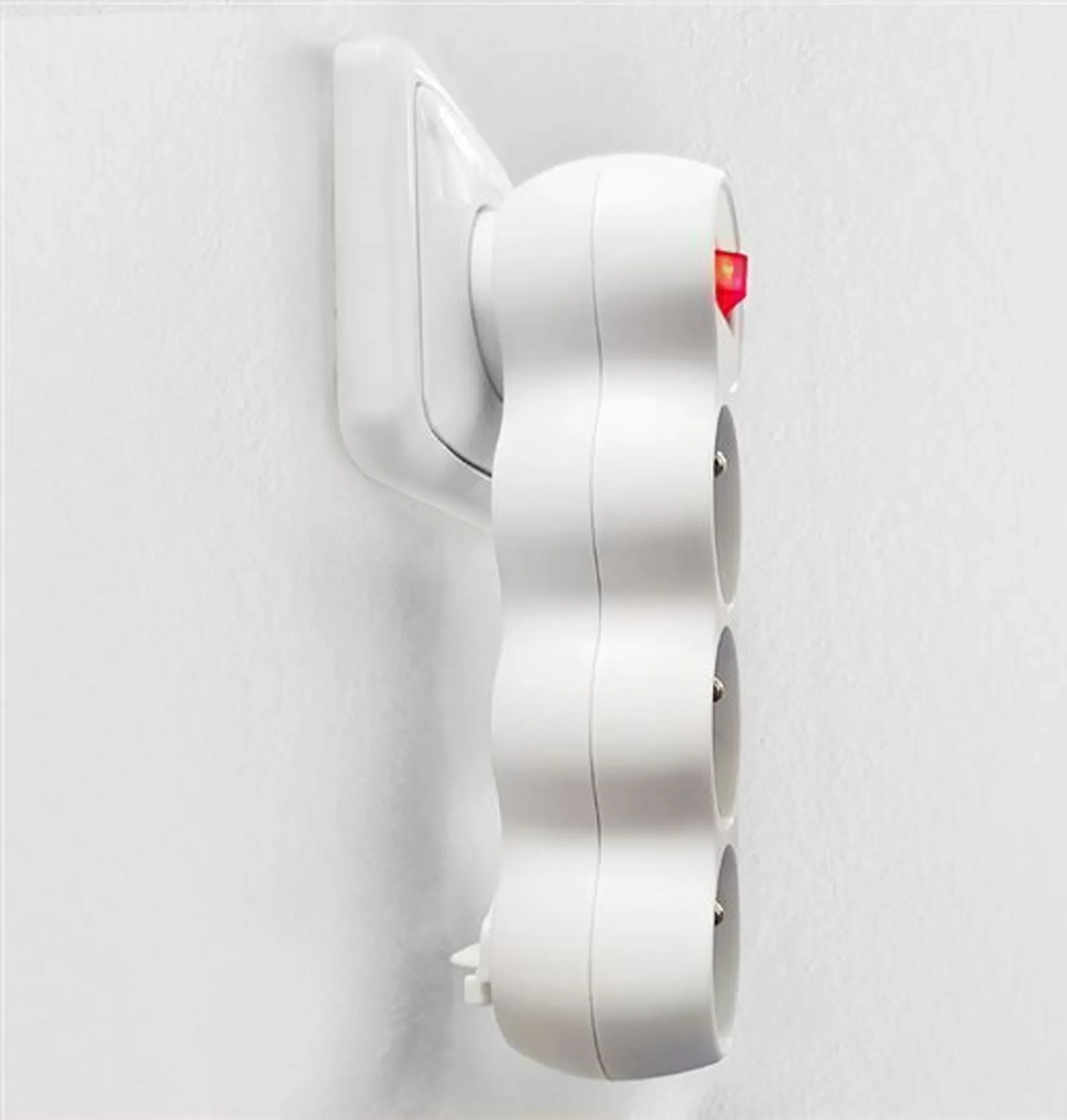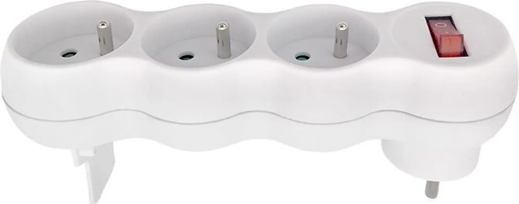 Kompakter 3-fach Verteiler-Adapter von Solight mit integriertem Schalter und praktischer Halterungsstütze. Ideal für Doppel-Wandsteckdosen, ohne die obere Dose zu blockieren. Durch die verstellbare Stütze bleibt der Adapter stabil, auch wenn Kabel häufig ein- oder ausgesteckt werden – perfekt für Schreibtische, Küchenzeilen, Werkstätten oder Mehrfachgeräte.